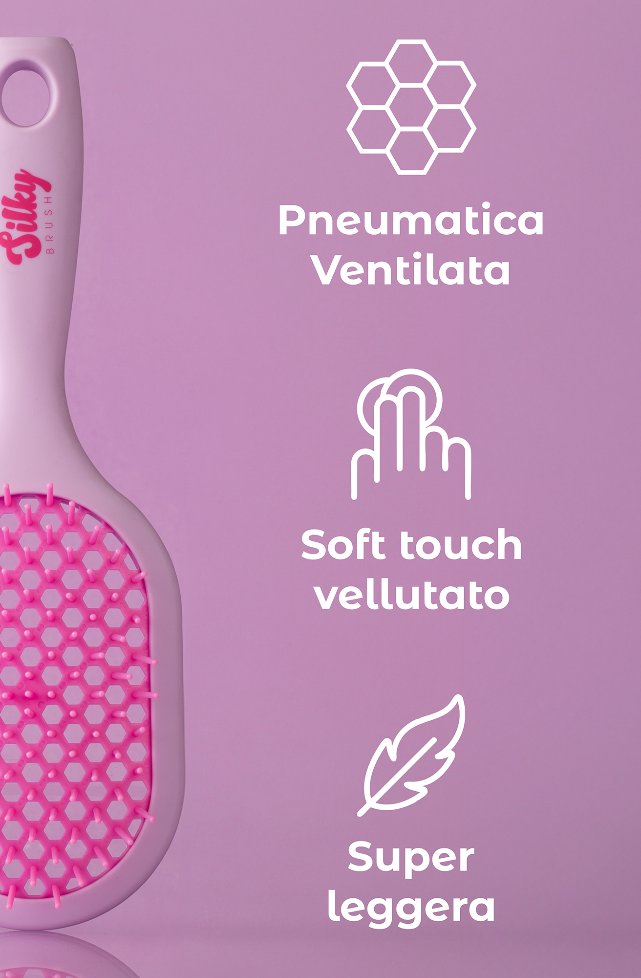 Le setole antistatiche districano senza spezzare e combattono l’effetto crespo, mentre l’impugnatura soft touch vellutata è una vera coccola per le mani.